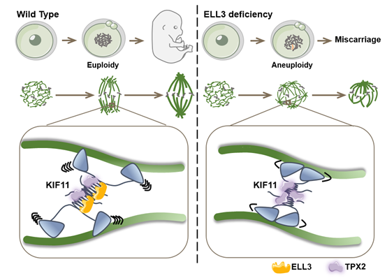 综上所述,该研究利用胚胎非整倍体反复自然流产的夫妇进行全外显子组测序数据,鉴定出一系列 ELL3功能缺失突变体。Ell3在卵母细胞中的缺失导致纺锤体结构的紊乱,以及卵子及胚胎非整倍体。Ell3母源性敲除小鼠亦表现出胚胎非整倍体、心脑发育缺陷及早期胚胎流产。在减数分裂期,ELL3定位于卵母细胞纺锤体。机制上,ELL3和TPX2相互拮抗协同调节马达蛋白KIF11的功能,促进纺锤体组装。活细胞染色体运动轨迹追踪进一步显示ELL3功能缺失可导致纺锤体组装异常和染色体运动停滞,造成染色体分离异常。该研究揭示了胚胎非整倍性的潜在遗传变异,并发现ELL3母源性功能丧失可导致胚胎非整倍性,为非整倍体流产的遗传学诊断提供了新的理论依据和早期筛查靶点。
