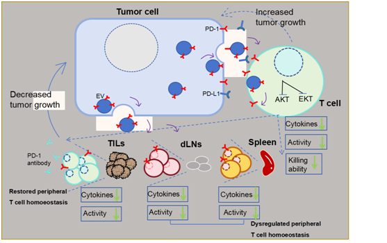 肿瘤细胞来源的细胞外囊泡(TEVs)可诱导免疫细胞功能障碍,损害抗肿瘤免疫监视。T细胞在抗肿瘤反应的各个方面都至关重要,其功能障碍是癌症有效免疫治疗的严重障碍。研究表明,TEVs是诱导T细胞功能障碍的主要因素之一。然而,肿瘤表达的PD-1是否可以通过EVs分泌并调节肿瘤免疫逃逸尚不清楚。