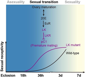 研究团队进一步发现,LK抑制幼年雌蝇性行为的功能受到昆虫生长发育的重要激素——蜕皮激素(ecdysone)的调控。蜕皮激素受体(EcR)在LK神经元中表达,蜕皮激素通过EcR调控LK神经元的活性,进一步抑制雌蝇的接受行为。此外,研究还发现神经肽LK的受体LKR在雌蝇接受行为的整合中枢pC1神经元中表达,并通过抑制pC1神经元的活性来调控雌蝇的接受行为。