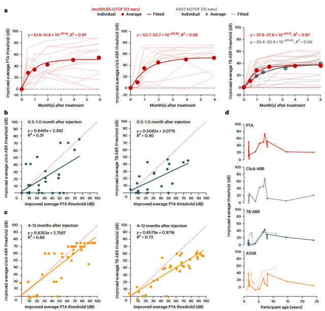 为解答这些问题,柴人杰教授团队进一步在国内实施了多中心临床试验,包括山东省第二人民医院(山东省耳鼻喉医院)、南京大学医学院附属鼓楼医院、华中科技大学同济医学院附属协和医院、第四军医大学西京医院、宁波市第二医院,首次纳入青少年及成人受试者,共招募10名1.5-23.9岁OTOF相关耳聋患者。研究持续12个月,通过耳部检查和血液检测密切监测安全性,同时采用客观测试(Click和短纯音ABR、ASSR)及行为评估(纯音测听PTA)衡量听力改善情况。在12个月随访期内,10名患者共报告162例I/II级不良事件,未发生III级及以上不良反应,有力证实该基因疗法的安全性。所有受试者平均纯音听阈从术前106 dB显著降低至52 dB(正常谈话水平),其中62%的听力阈值改善出现在治疗首月;术后6个月内,部分儿童受试者实现了正常的听觉功能(<20 dB),青少年和成年患者在的平均纯音听阈分别改善了46 dB和36 dB。其中的两名受试者实现接近正常的言语感知能力。以上表明,虽然听觉通路可塑性随年龄增长递减,但基因治疗在青少年及成人群体仍具显著疗效。此外,研究发现听觉脑干反应在治疗4个月后可作为行为听力的有效预测客观指标,表明突触修复已经完成。该研究的另一个重要发现是:5至8岁儿童获益最为显著。相较于1-5岁的幼儿、青少年和成人,这一年龄段的患者在多个听力学指标中表现更好的听力改善。这一有违直觉的临床发现令人意外——理论上,早期保留的内耳完整性和功能应预示更佳治疗反应,但这些发现表明,大脑处理新恢复声音的能力可能随年龄而异,其原因尚待探究。