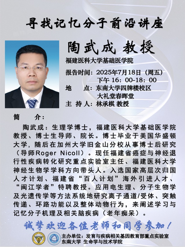 寻找记忆分子前沿讲座——福建医科大学基础医学院院长陶武成教授