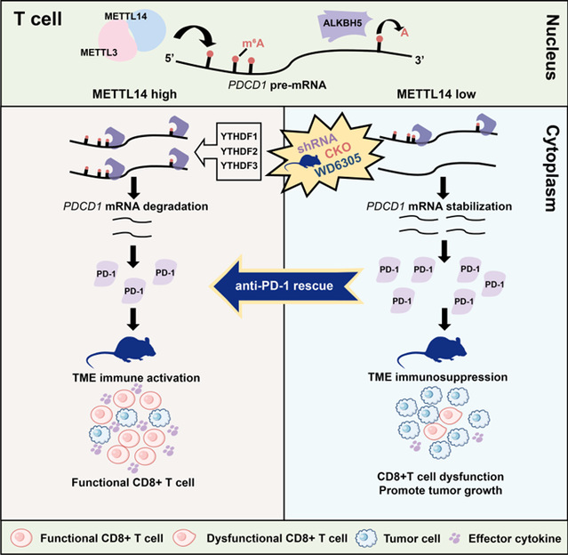 METTL14-YTHDF1/2/3-PD-1轴调控T细胞抗肿瘤免疫作用的模式图