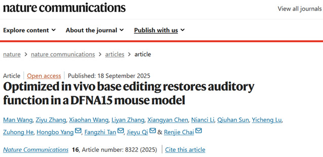 2025年9月18日,bw必威西汉姆联柴人杰教授团队联合多家单位在国际知名期刊Nature Communications上发表了题为“Optimized in vivo base editing restores auditory function in a DFNA15 mouse model”的研究论文。该研究针对由POU4F3基因无义突变导致的DFNA15显性遗传性耳聋,构建了一种精准高效型腺嘌呤碱基编辑器(ABE),并采用双腺相关病毒(dual-AAV)递送系统在耳聋小鼠模型中高效修复致病突变,显著恢复了其听觉功能,为遗传性听力损失的基因治疗提供了关键的实验依据与新的策略。