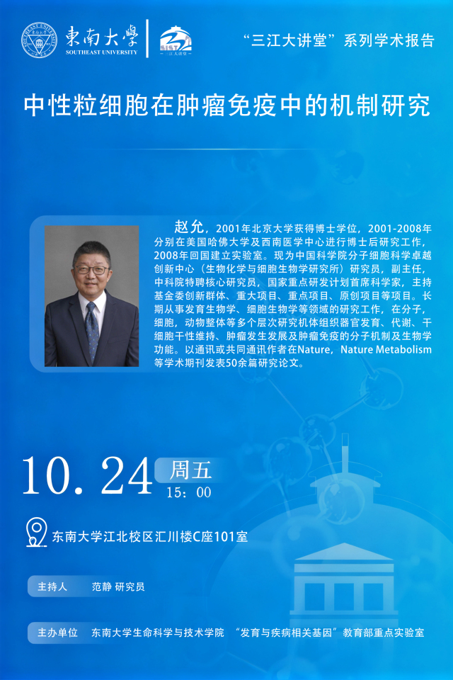 “三江大讲堂”系列学术报告——中科院分子细胞科学卓越创新中心 赵允研究员:中心粒细胞在肿瘤免疫中的机制研究