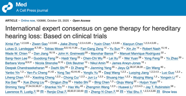 2025 年 10 月 23 日,全球首个遗传性耳聋基因治疗国际专家共识在Cell Press旗下期刊医学期刊 Med 上正式发布,并登上 Cell Press 官网头条。
