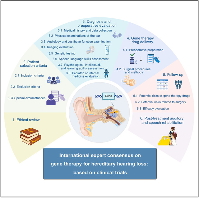 该共识为遗传性听力损失的基因治疗提供了首个全球认可的框架,共形成了 30 条共识声明,涵盖了遗传性听力损失基因治疗的六大关键模块——伦理审查(1 条声明)、患者筛选(12 条声明)、术前诊断和评估(9 条声明)、基因治疗药物递送(4 条声明)、术后随访(3 条声明)以及治疗后的听觉和言语康复(1 条声明)。