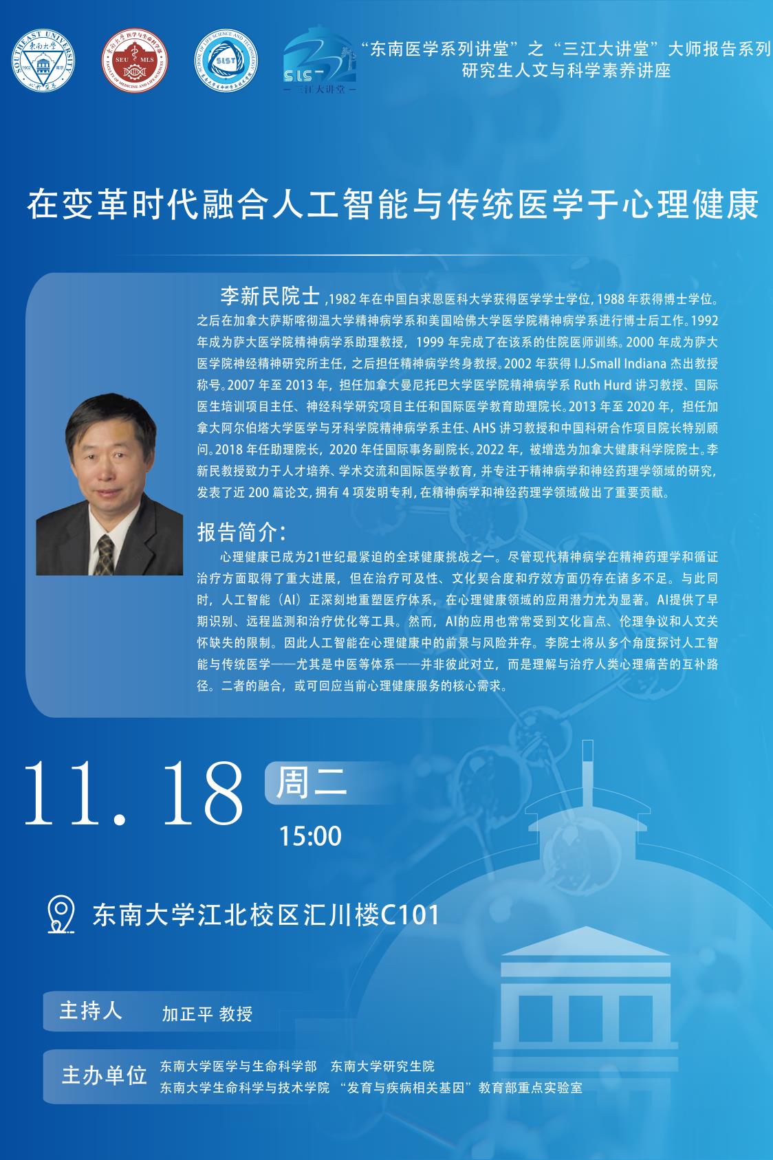 “三江大讲堂”大师学术报告——加拿大阿尔伯塔大学李新民院士:在变革时代融合人工智能与传统医学于心理健康