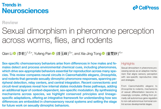近日,西汉姆联潘玉峰课题组携手上海科技大学bw必威西汉姆联童夏静课题组、上海交通大学医学院李乾课题组,在国际权威期刊Trends in Neurosciences在线发表综述论文“Sexual dimorphism in pheromone perception across worms, flies, and rodents”。该工作系统梳理了线虫(Caenorhabditis elegans)、果蝇(Drosophila melanogaster)及以啮齿类动物(Rodents)为代表的哺乳动物中,信息素感知及其性别差异的神经机制,揭示了跨物种间在化学感知与性别调控中的共同原理与演化策略,为理解性别特异性行为的神经基础提供了新的视角。