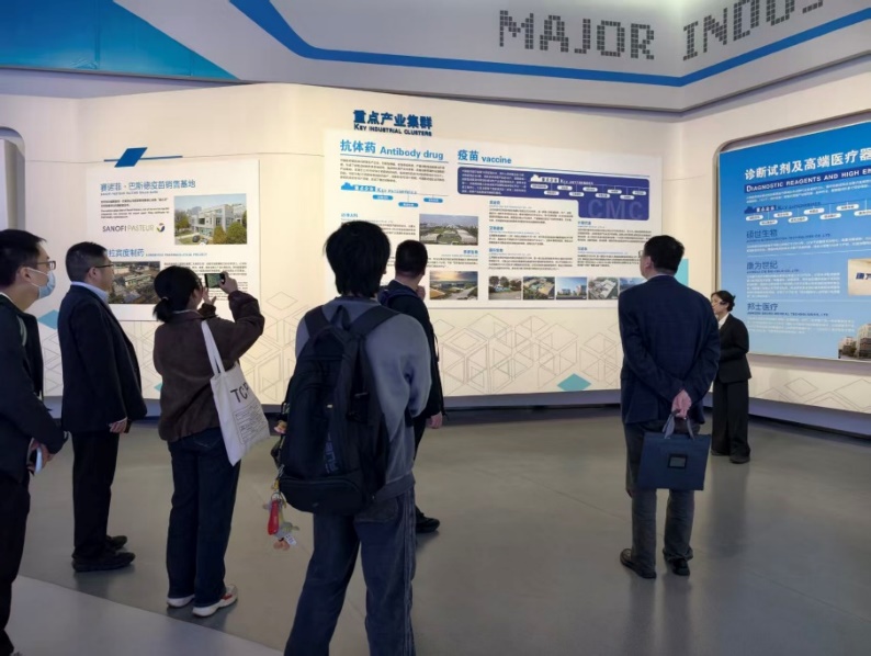 师生首站来到中国医药城核心展区,系统了解泰州大健康产业的发展概况。作为全国唯一的国家级医药高新区,中国医药城以“中国第一、世界有名”为发展愿景,已形成从研发、孵化到产业化的完整生态链条。讲解员详细介绍了产业集群、发展历程及专项政策支持,并带领大家参观了国际精准健康中心的功能布局。从疫苗、抗体药到诊断试剂,一幅生机勃勃的产业图景徐徐展开,为后续参访奠定了坚实的产业认知基础。
